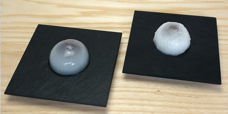 「熊野 水もうで」のお召し上がり方 「熊野 水もうで」の食べ頃のお目安。 写真左側が食べ頃の状態です。表面がぷるんとなり艶のある状態です。写真右側が冷凍庫から出して器に飾った直後の状態です。お召し上がりになる際の参考にしてください。 器に飾って一工夫 お皿に置いて解凍していただくと、形が崩れず綺麗に盛り付けすることができます。 ちょっとした、ご来客へのおもてなしにも最適です。